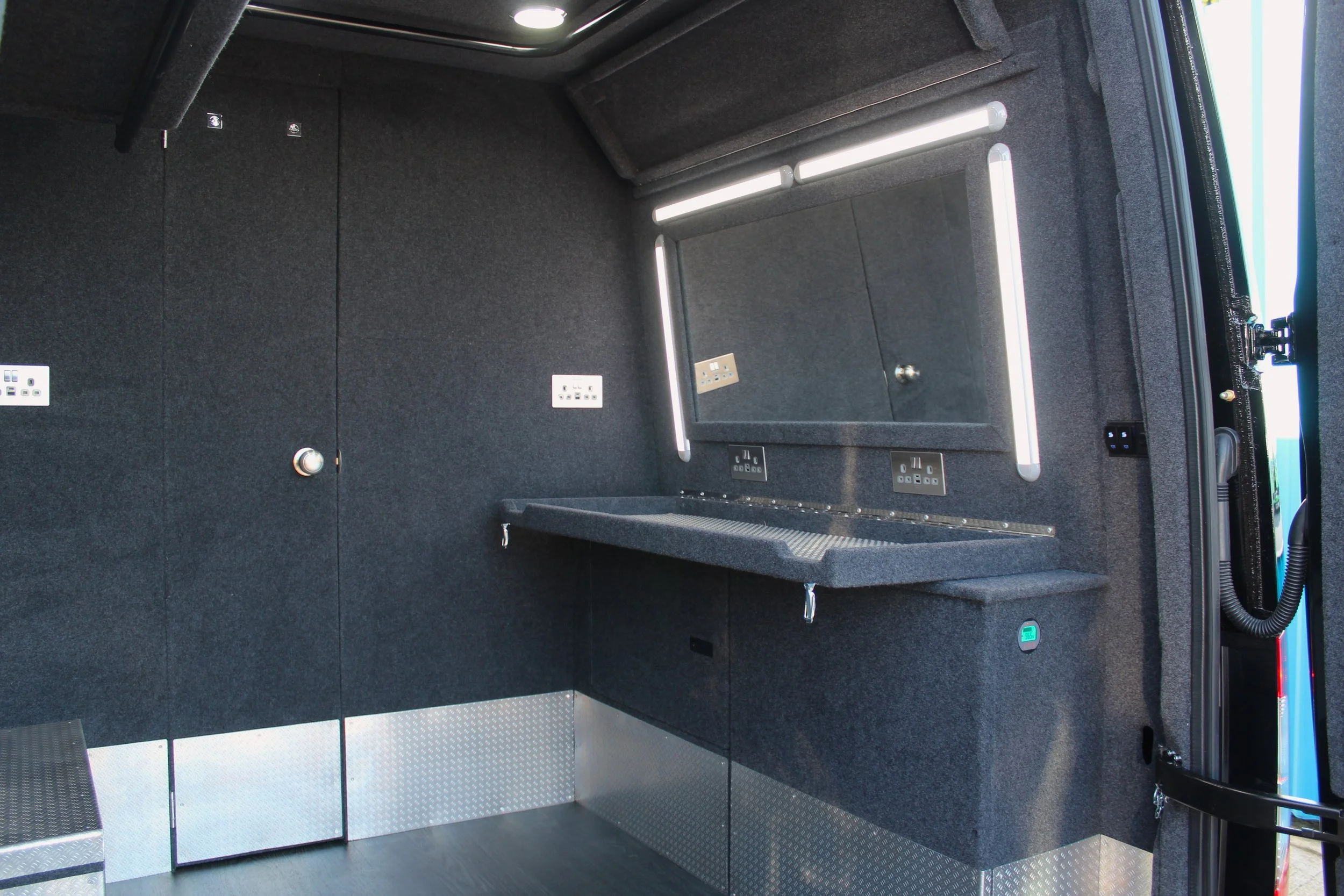 Their latest tour bus is again based on the Mercedes Sprinter L3H2 and features a split rear saloon configuration with a premium passenger cabin in the front and a dressing room with fold-away LED illuminated mirror in the rear.