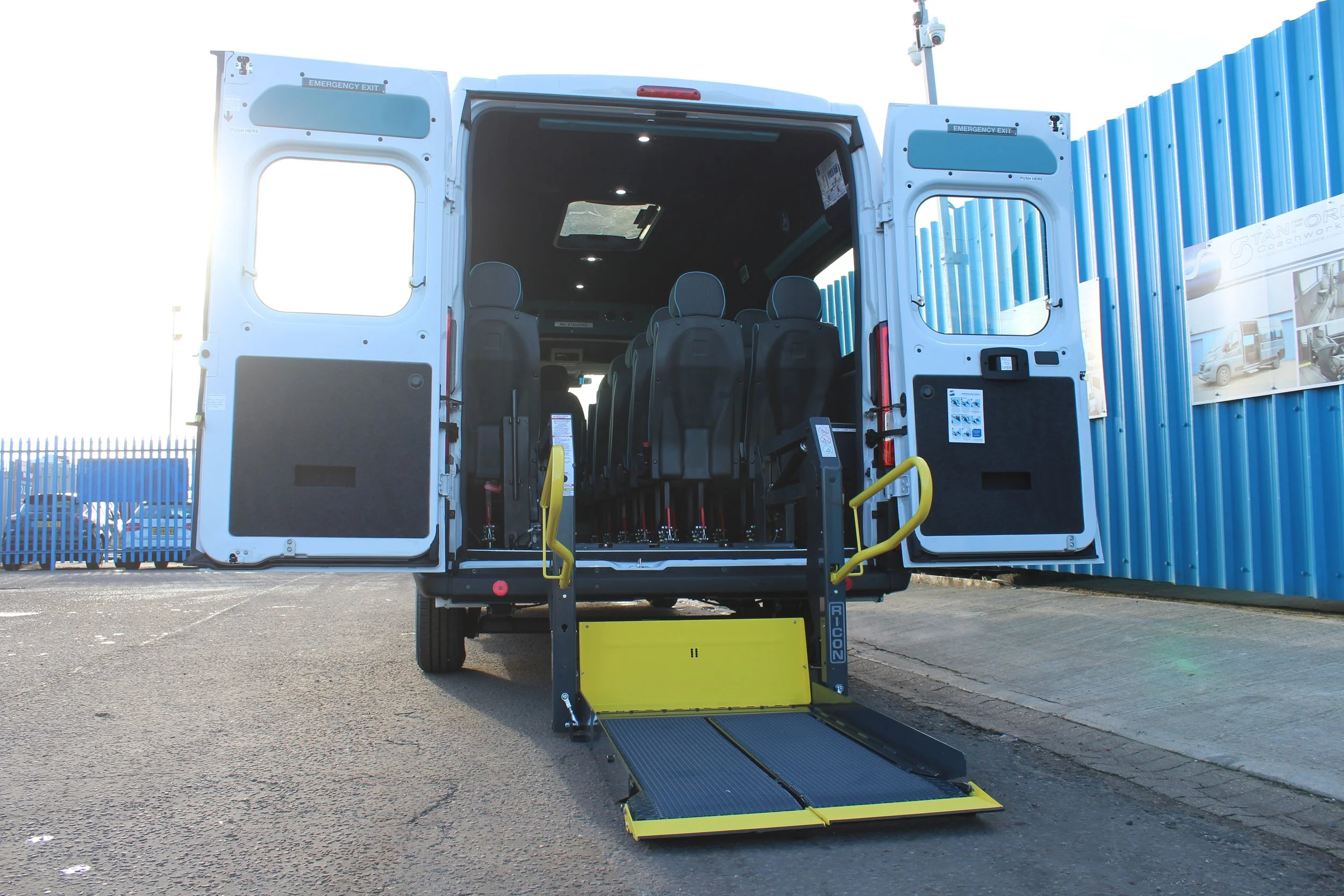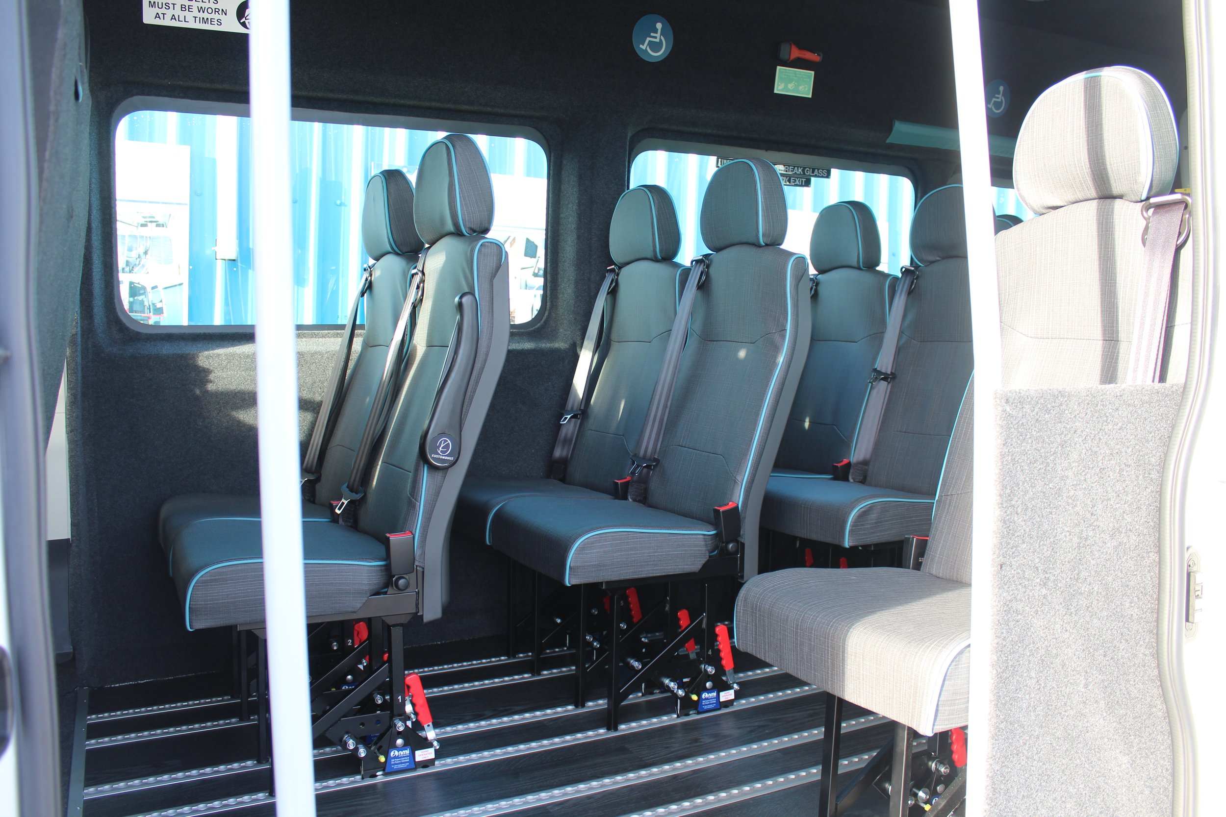 The community transport’s new minibus features SCW blue Eclipse seating, our exclusive fold‑out low‑entry side step and a PLS underfloor tail lift for easy, accessible boarding. To keep passengers comfortable the vehicle is fully equipped with Eberspaecher heating and air conditioning. Additional key features include a custom storage compartment in place of the front cab passenger seat, LED blue and white interior lighting with low‑level blue floor illumination, and upper cant rail tracking. Take a closer look at the vehicle below.