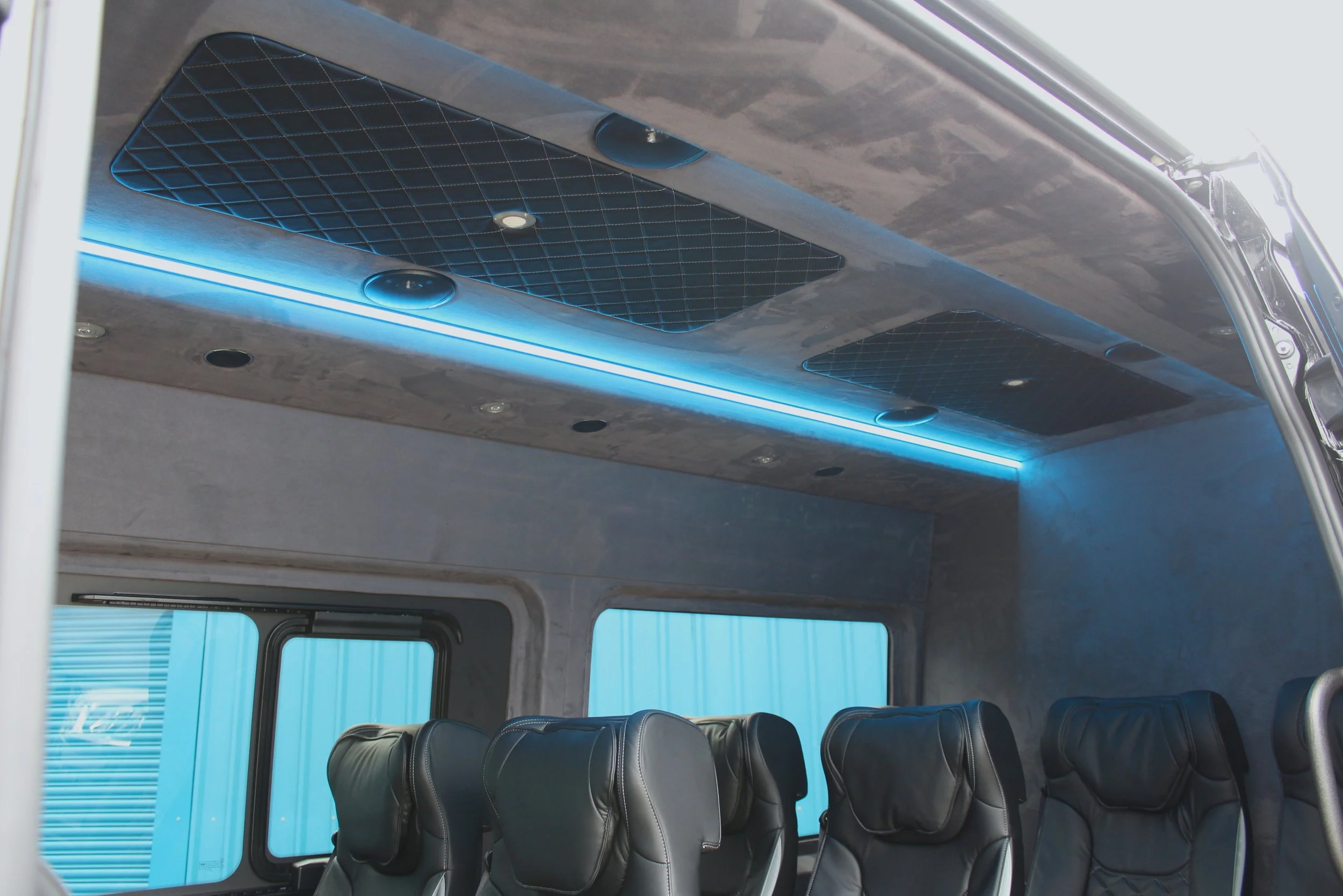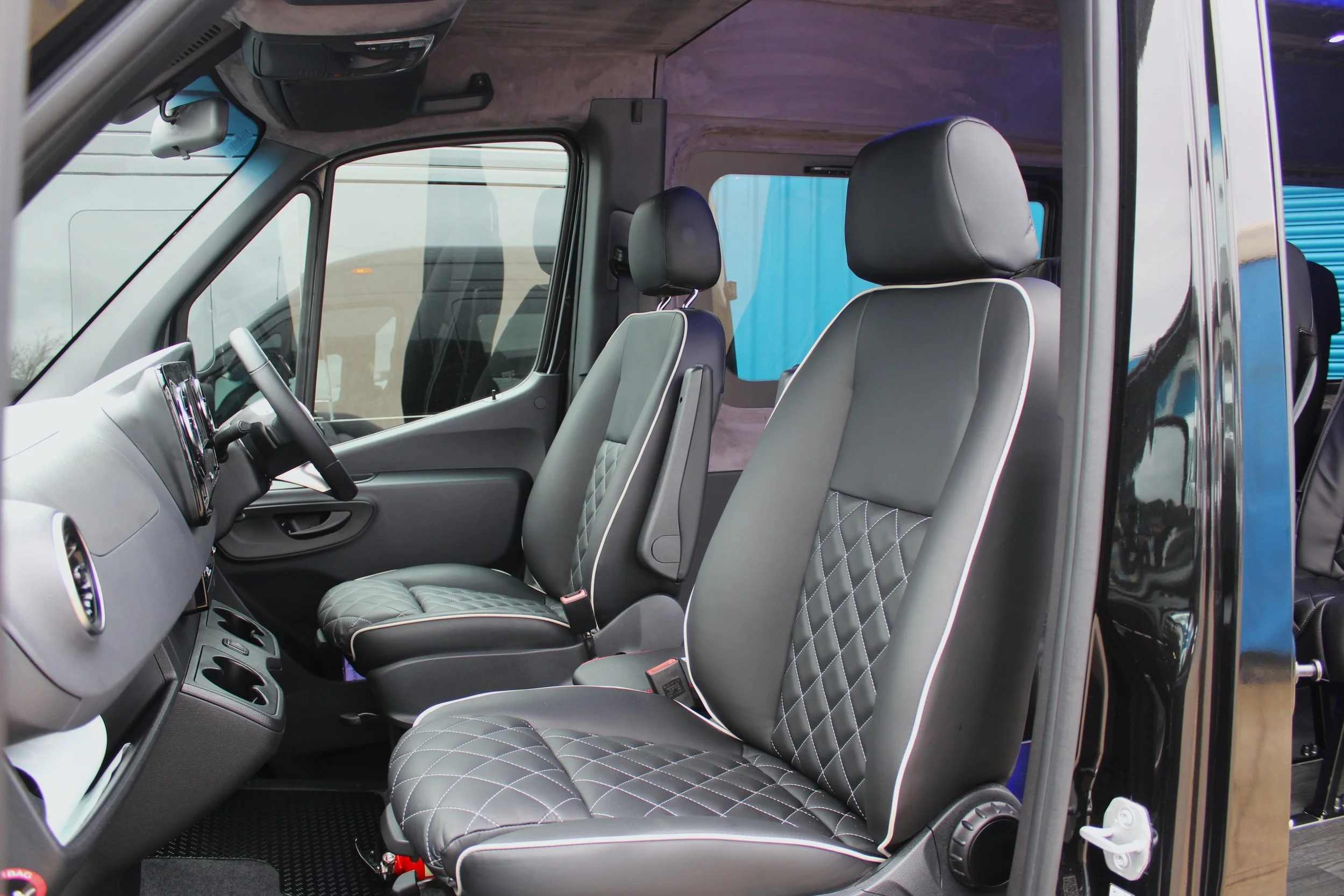 Both of Signature’s new vehicles are identical, each built on the Mercedes Sprinter L3H2. Designed to carry up to eight passengers plus driver, both vehicles feature a luxurious cabin trimmed in silver suedeflex and black vegan leather, with seven premium reclining passenger seats. All seating is finished in black vegan leather with silver diamond stitching.