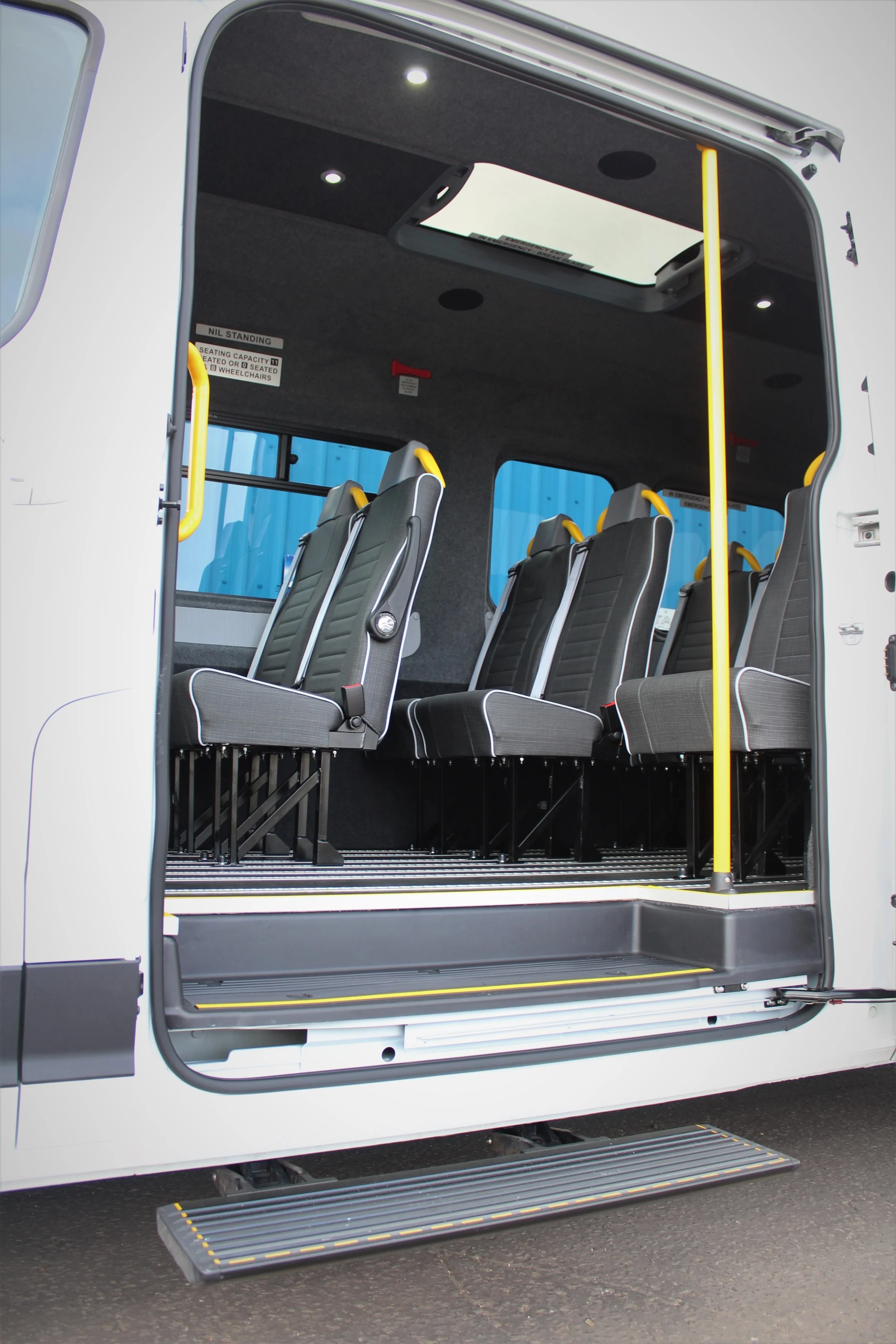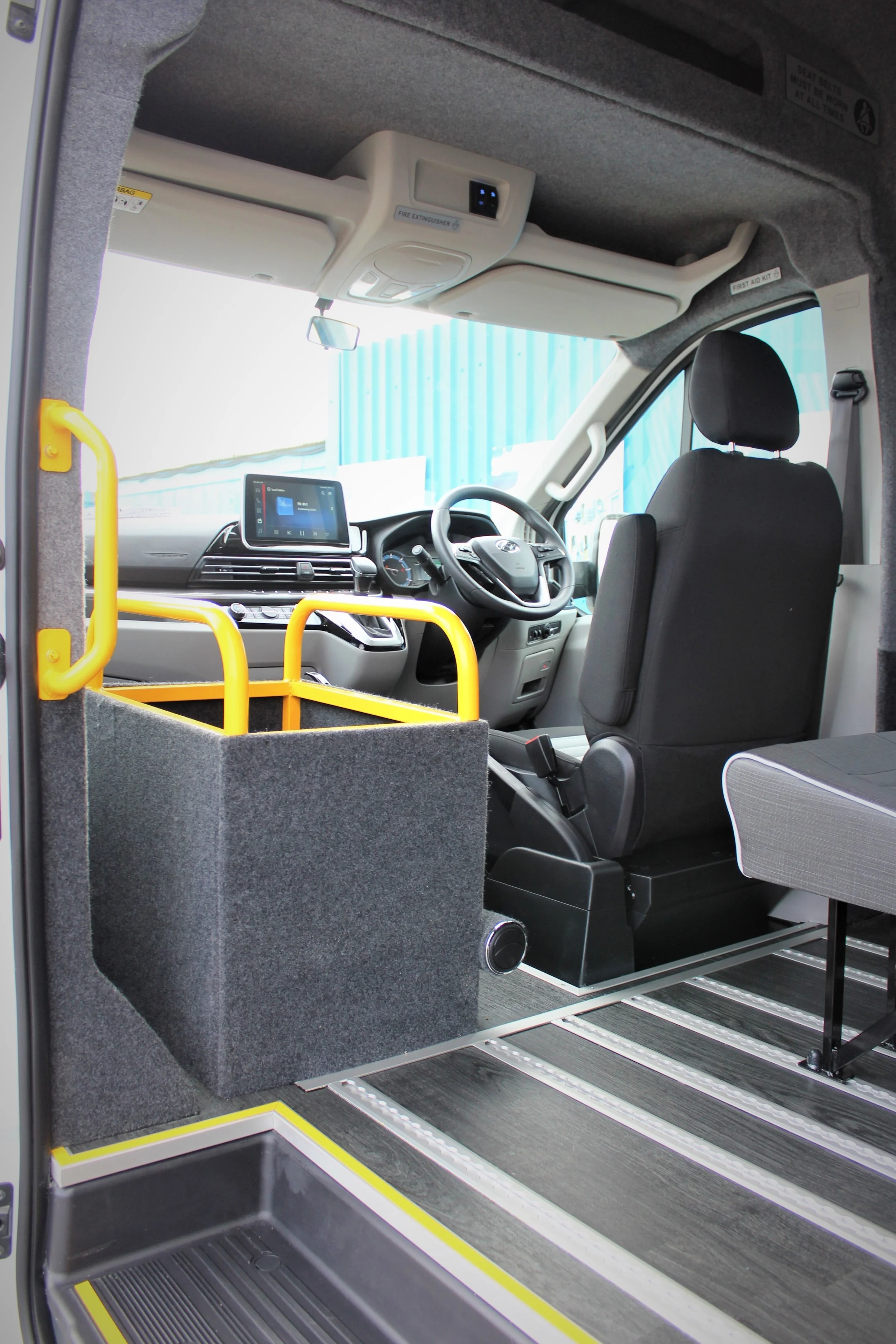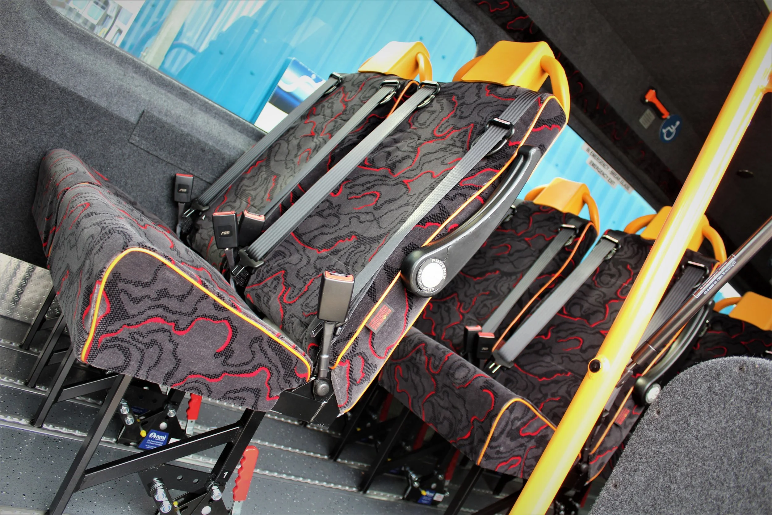 Waverley Hoppa’s fully electric minibus is based on a M2 brake-approved Maxus eDeliver 9 and can transport up to eleven seated passengers. Their new minibus features an upgraded interior with grey wood-effect flooring and seats upholstered in a premium wipe clean grey material, complete with custom ‘S-style’ silver stitching and piping. To add a splash of colour, we finished all of the vehicle’s grab handles in bright yellow. To find out more about this vehicle, head over to our news page by clicking here.