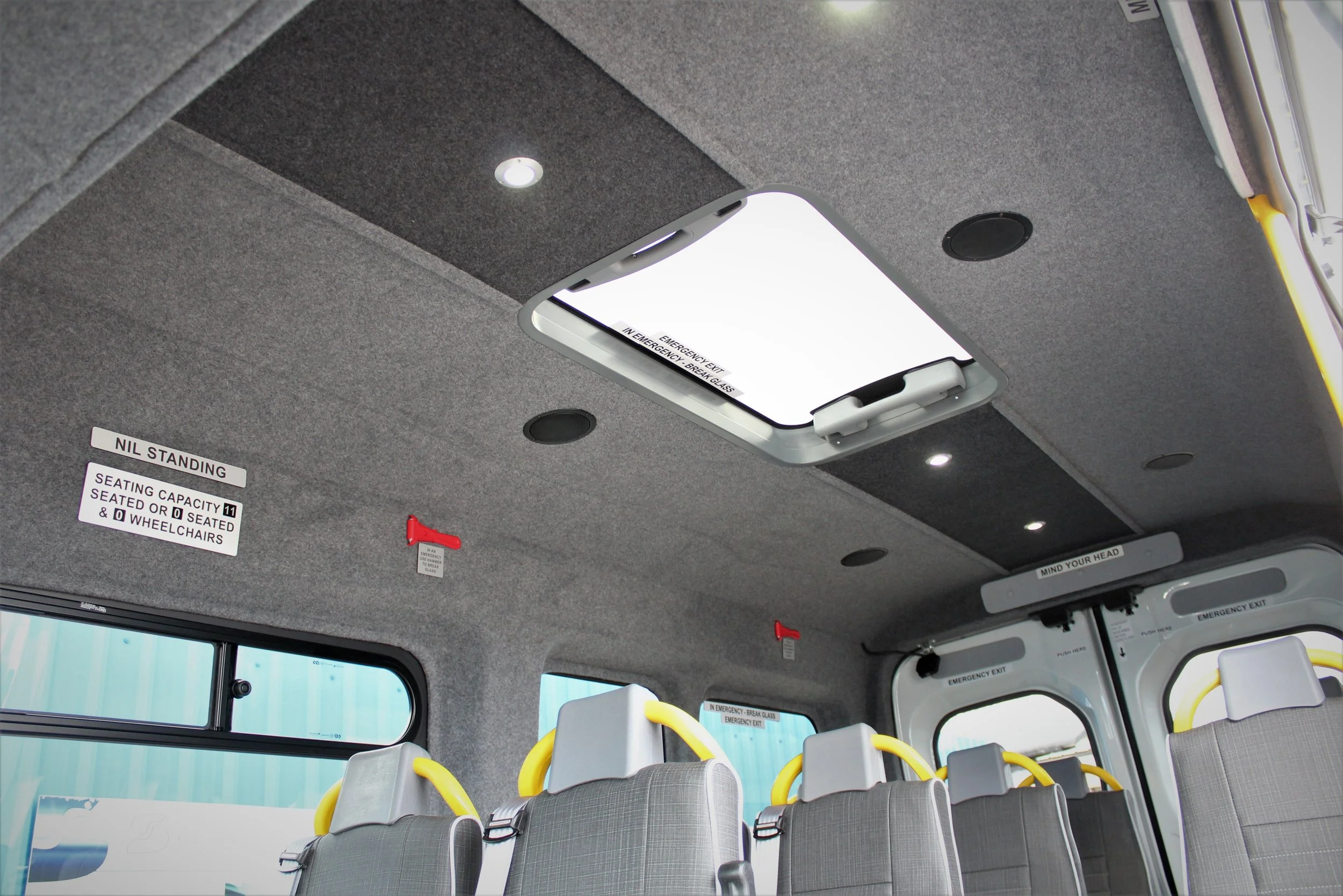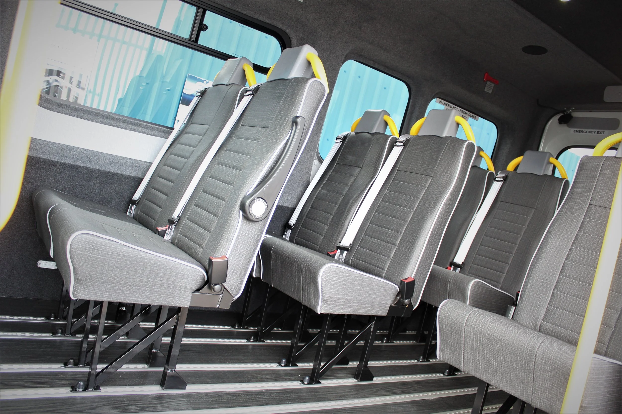Each vehicle can transport up to 14 seated passengers, however this particular vehicle was delivered with just 8 removable seats as it will immediately be put to work transporting multiple disabled passengers. With all seats removed, the innovative Flat Floor design provides enough room to transport up to 5 wheelchairs at any one time.