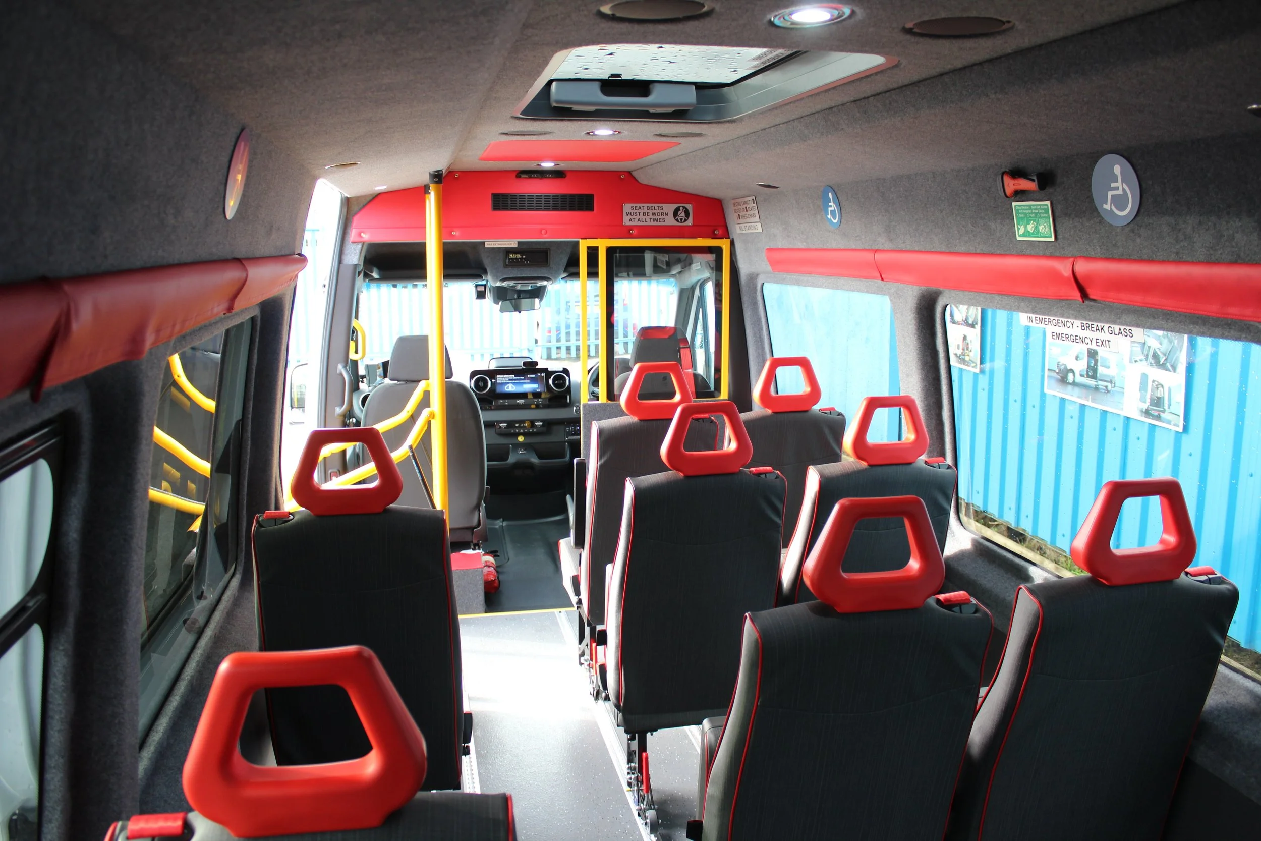 Inside, the vehicle showcases a premium finish with colourful red accents, complemented by a black suedeflex roof centre panel and ambient LED colour-changing lighting. The rear saloon features eight removable passenger seats upholstered in black vegan leather with our grey SCW Eclipse stitch design. The front cabin seats have also been reupholstered with the same Eclipse design for seamless, unified look.
