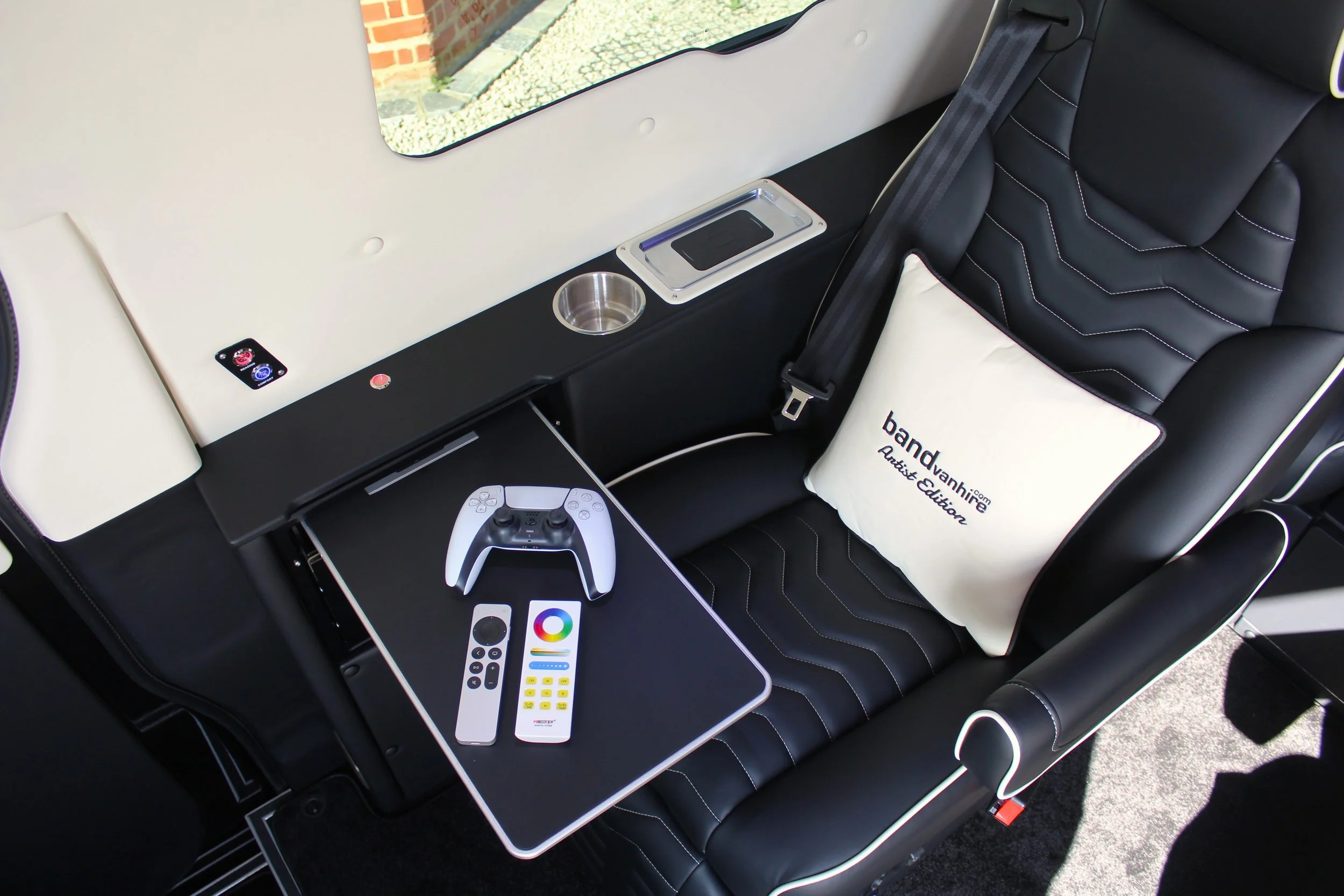 Based on the Mercedes Sprinter L3H2, the Artist Edition Tour Bus features six luxury GT-design passenger seats upholstered in black vegan leather with cream stitching and piping. All six VIP seats feature electric recline, heat and phone charging sockets. The front two master seats also feature electric leg rests. With vegan leather wipeable side walls, seats and hard-wearing black carpet the interior design balances luxury with durability - ideal for long-haul touring.