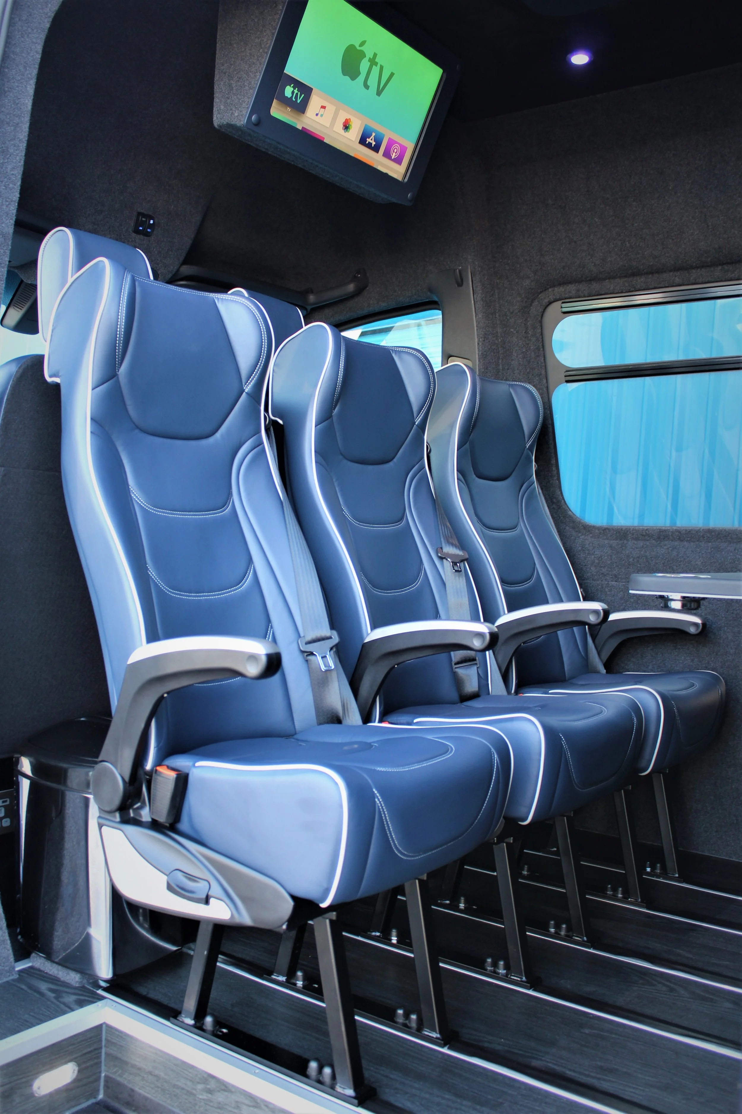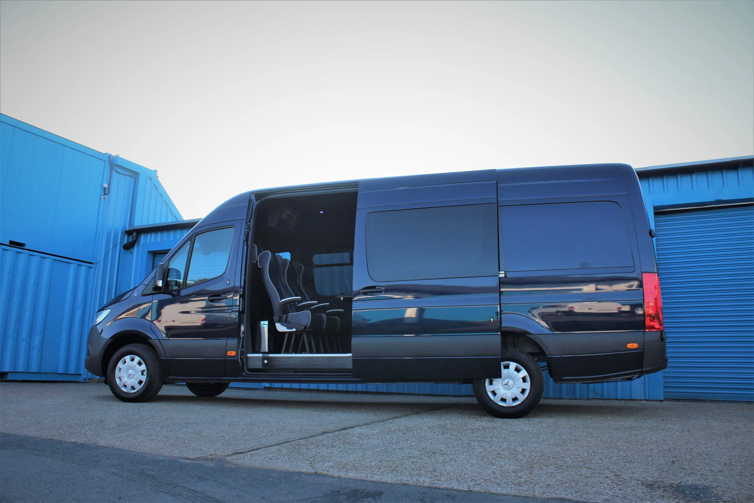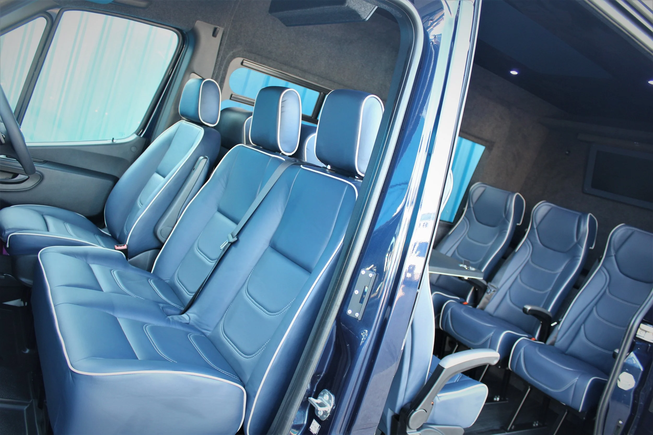 When designing their previous vehicles, we worked closely with Ooosh Tours to help create a bespoke specification which meets all of their requirements. Their two new vehicles have been converted to this same specification and are again based on L3H2 Mercedes Sprinters finished in blue metallic paint to match their previous splitters. To cater for all of their self-drive clients, one of the new vehicles features automatic transmission and the other, manual transmission. The custom Sprinters are split into two sections - a comfortable passenger saloon in the front for touring entertainers and a large equipment storage area in the rear.