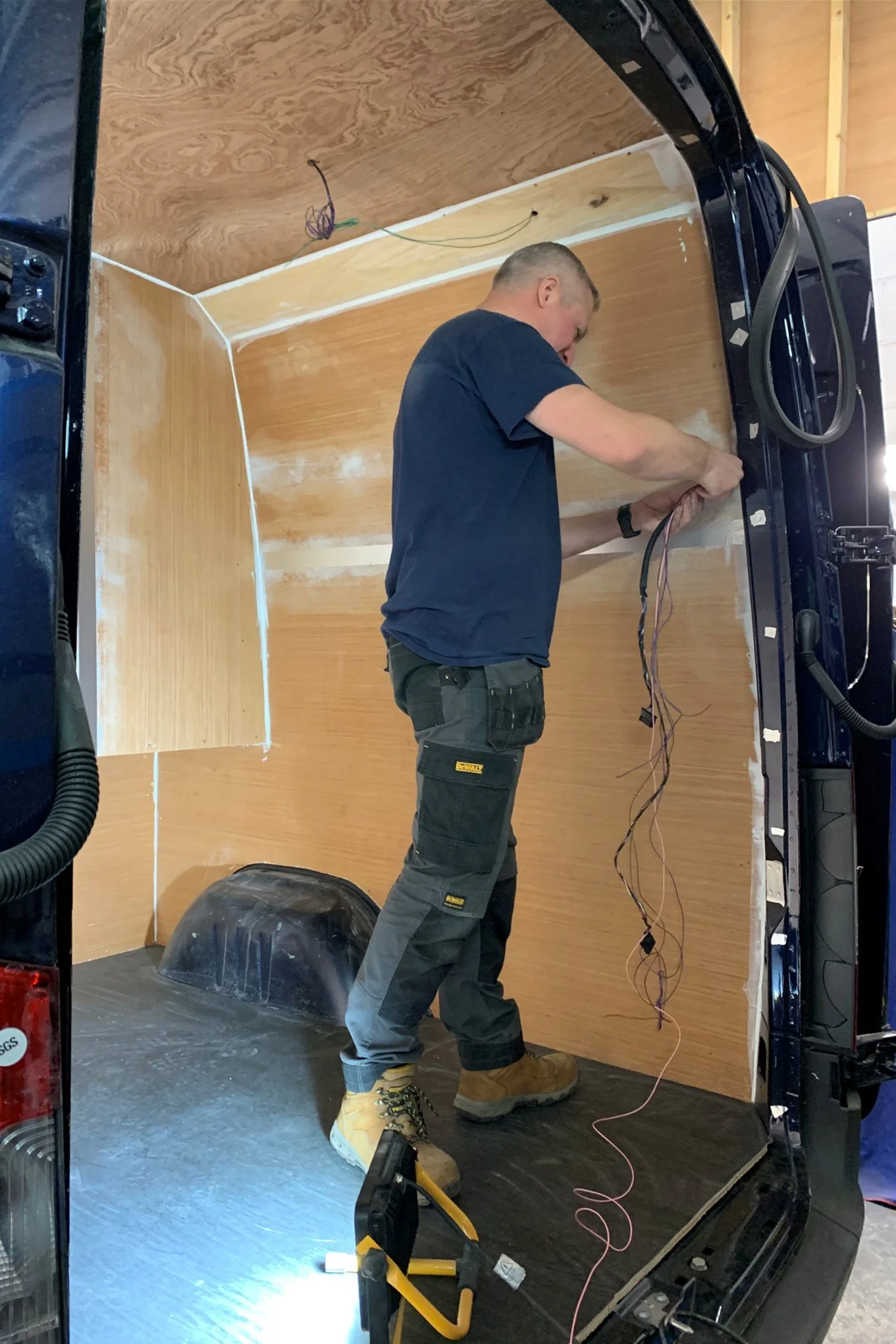 As with all of our splitter bus conversions, we had to ensure that the custom-built storage space at the rear of the vehicle was used as efficiently as possible. This area must be large yet secure as it will be used to transport and store production and musical equipment. To do this, we have lined the interior with matching soft-feel grey material and we have capped each wheel arch, then extended it, to create an open secure compartment.