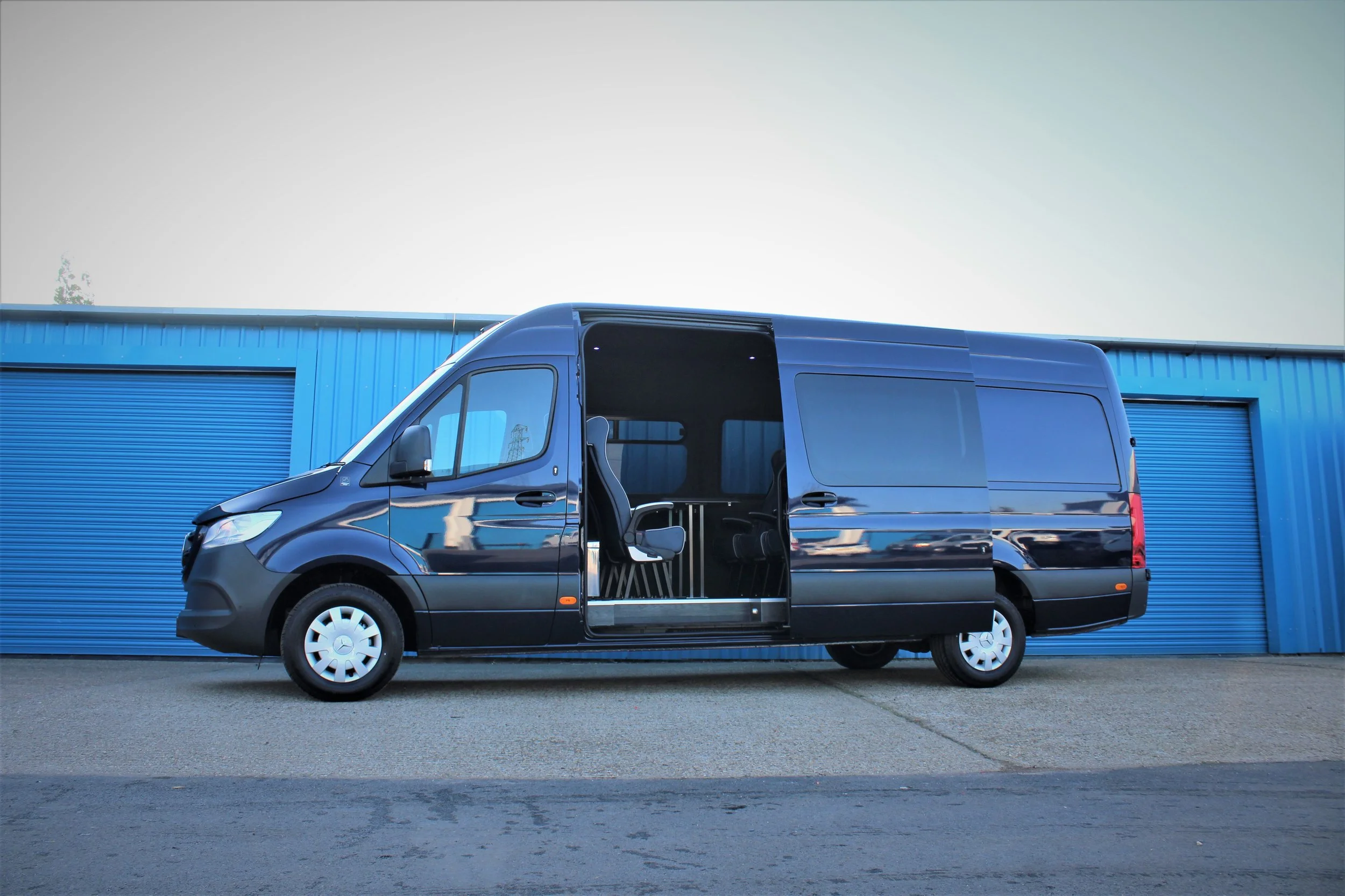 Both vehicles based on a L3H2 Mercedes Sprinter in dark metallic blue (one automatic transmission, one manual transmission)