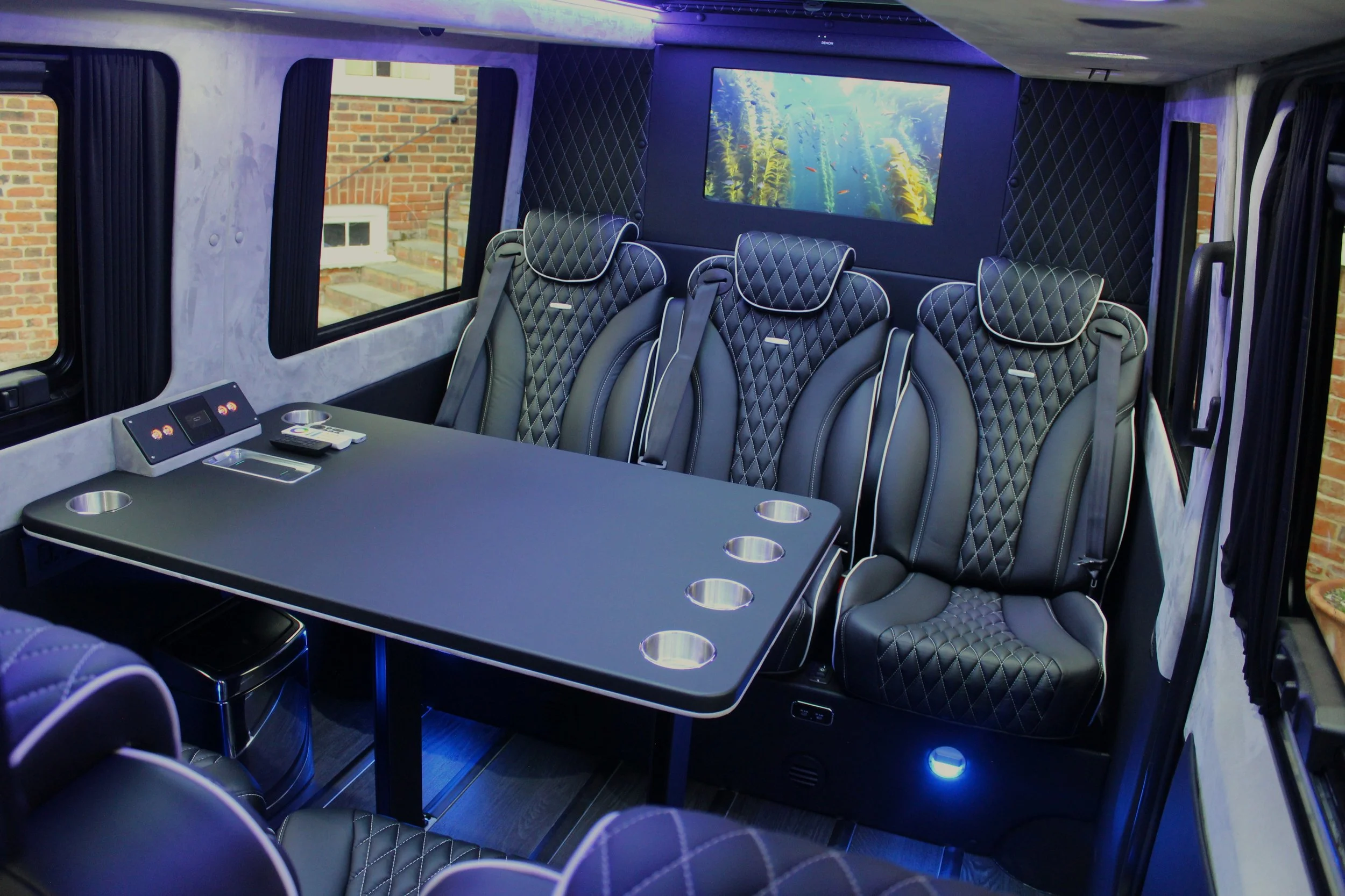 Reel Drive’s latest vehicle, based on the Mercedes Sprinter L2H1, offers seating for up to seven passengers plus driver and is tailored for comfort, connectivity, and visual impact. The rear cabin features six VIP passenger seats upholstered in black vegan leather with silver diamond stitching and silver piping, set against a refined interior trimmed in silver suedeflex on the upper panels and roof, and black vegan leather on the lower sides.