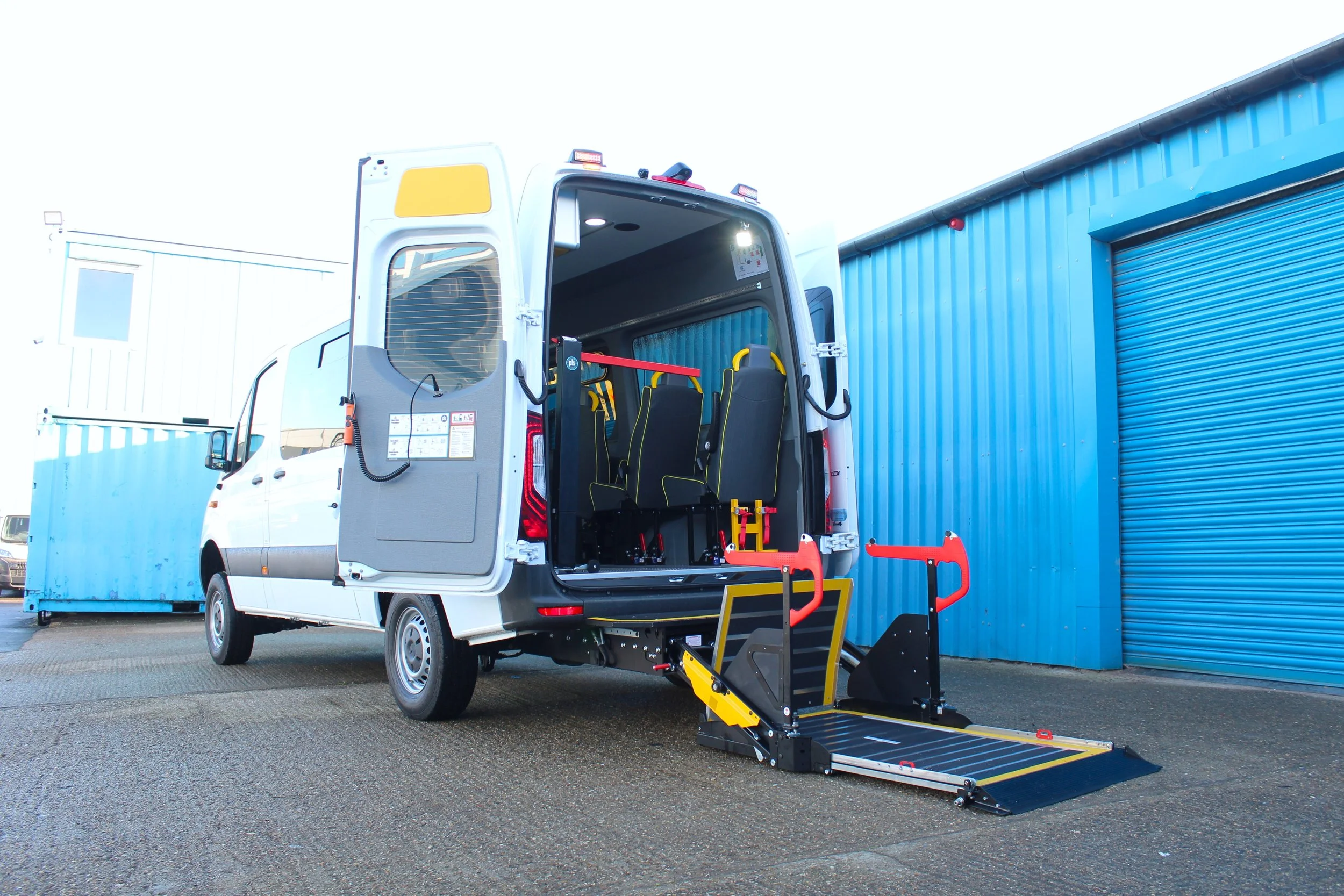 Inside, we have designed the vehicle for practicality and hygiene. All surfaces are fully wipe clean including the passenger seats which are upholstered in durable grey wipe-clean material with yellow piping. To ensure effortless passenger access, the vehicle is equipped with our exclusive fold-out low-entry side step at the side load door. For wheelchair users, a PLS underfloor tail lift has been installed at the rear, providing safe and convenient entry and exit.